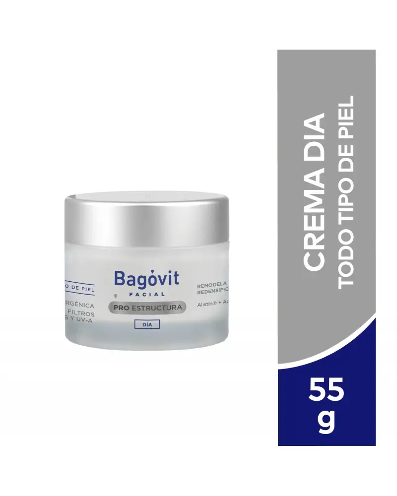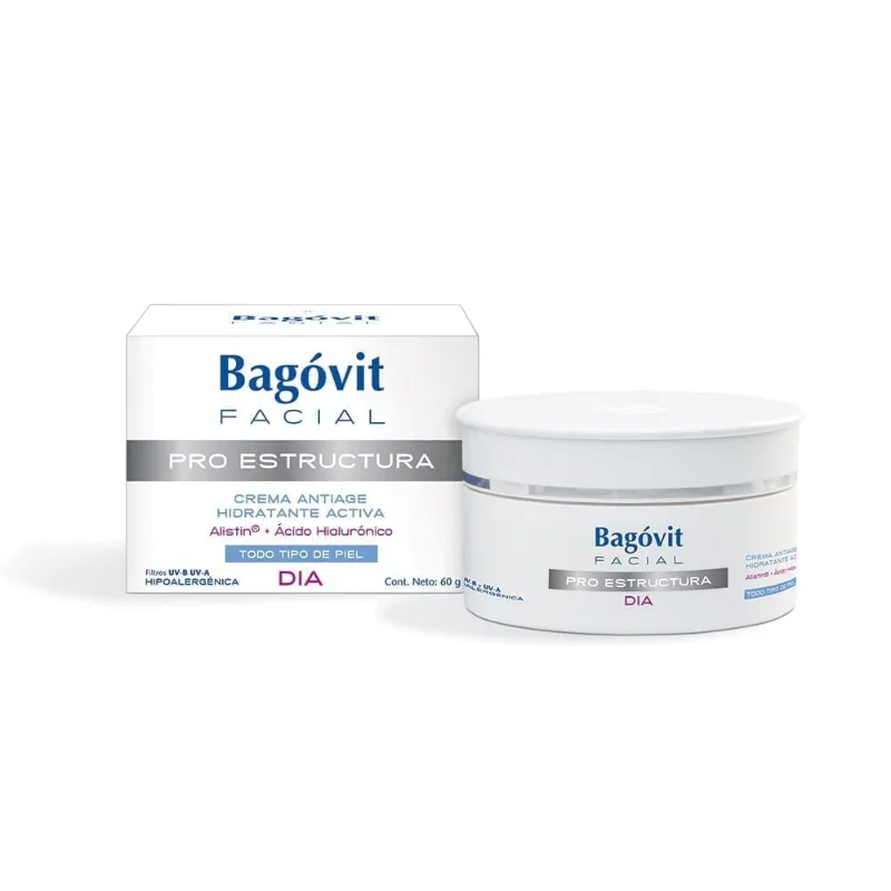 La Crema Facial Pro Estructura Día Bagóvit es una crema hidratante activa anti cross-linking para el uso de día. Está formulada con Alistin y Ácido Hialurónico, componentes que brindan una profunda hidratación a la piel restableciendo la elasticidad y protegiéndola de las agresiones diarias del medio ambiente. Su eficacia está comprobada clínica y dermatológicamente. En 4 semanas la piel del rostro luce más hidratada, firme y elástica. Piel suave y saludable por mucho más tiempo. Apta para todo tipo de piel.