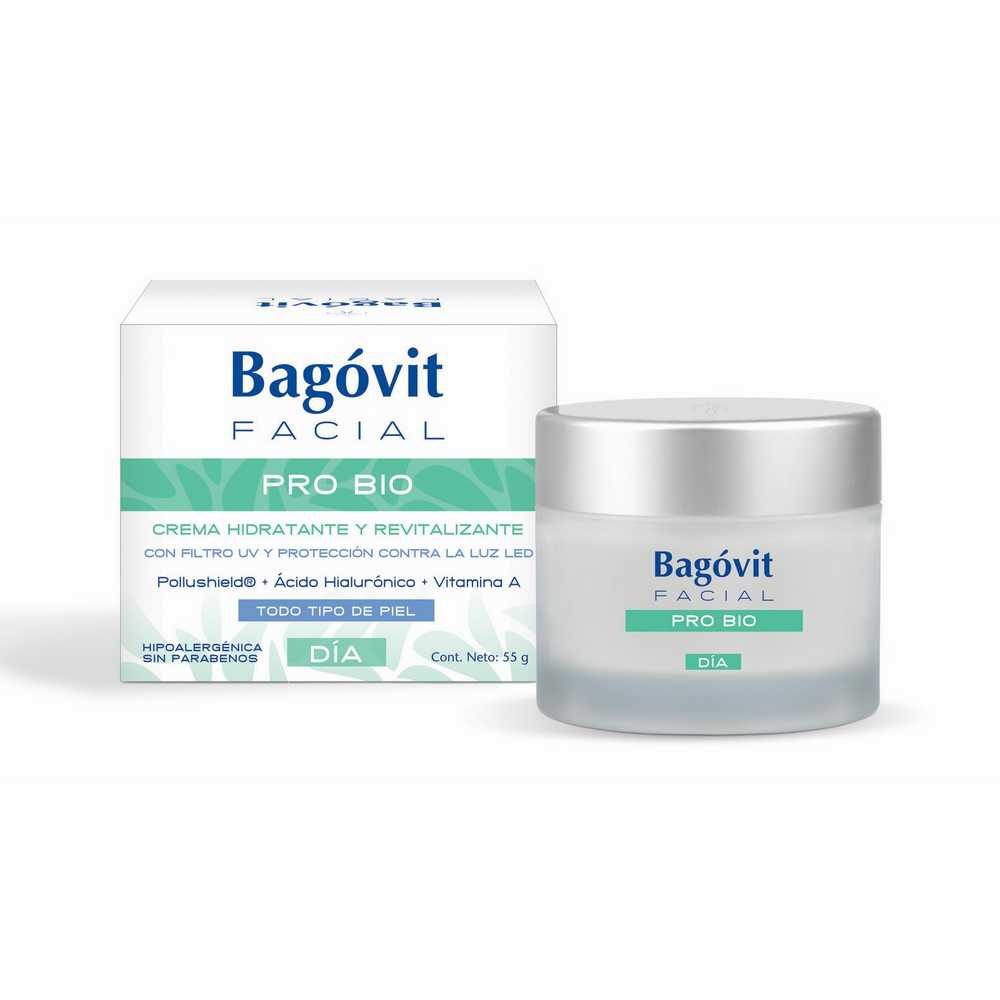 La Crema Facial Pro Bio Revitalizante de Día Bagóvit contiene Pollushield, Ácido Hialurónico y Vitamina A. Su fórmula multiprotectora revitalizante tiene filtro UV y protección contra la luz led. Protege de las agresiones del medio ambiente y la polución logrando que la piel esté hidratada, suave, protegida y saludable por más tiempo. Luego de dos semanas los signos de estrés y fatiga no se perciben en el rostro, los pliegues están menos marcados y las líneas de expresión se relajan.