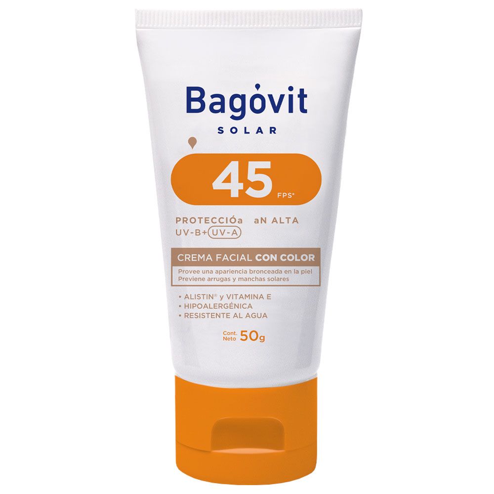 Bagóvit Solar Facial FPS 45 contiene además de sus exclusivos filtros UVB y UVA entre sus ingredientes Alistin y Vitamina E con importantes propiedades antiradicales libres (responsables del fotoenvejecimiento cutáneo y las manchas producidas por el sol.
