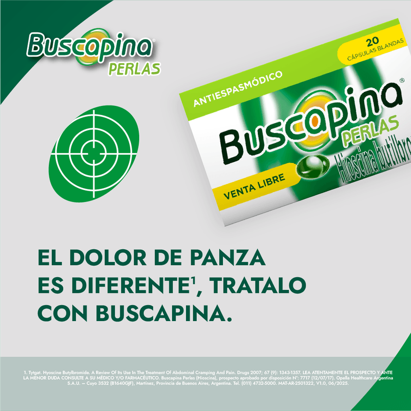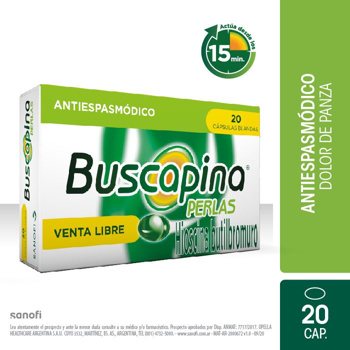 butilbromuro de hioscina, un antiespasmódico eficaz para aliviar espasmos abdominales, cólicos intestinales y molestias por tensión gastrointestinal. Presentación en cápsulas blandas de acción rápida.