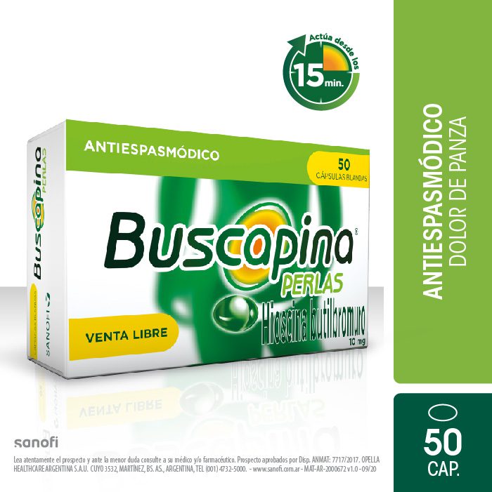Buscapina Perlas contiene butilbromuro de hioscina, un antiespasmódico eficaz para aliviar espasmos abdominales, cólicos intestinales y molestias por tensión gastrointestinal. Presentación en cápsulas blandas de acción rápida.