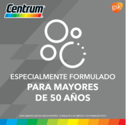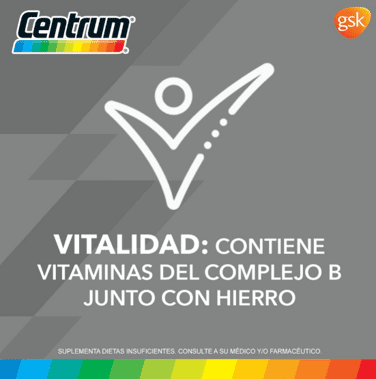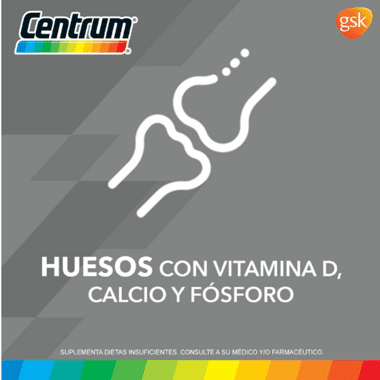 Centrum Silver es un suplemento dietario con Vitaminas y Minerales, especialmente formulado para ayudar a satisfacer las necesidades nutricionales de los mayores de 50 años. Suplemento dietario a base de vitaminas y minerales en comprimidos recubiertos. Centrum Base es un multivitamínico-multimineral, con 13 vitaminas y 11 minerales. Fórmula completa de la A al ZINC. Centrum es el multivitamínico #1 en ventas en el mundo. Modo de uso: Adultos (mayores de 50 años): Tome 1 comprimido recubierto (una porción) de Centrum Silver al día, acompañado de suficiente líquido. Consumir máximo 1 comprimido recubierto (una porción) al día. Formulado desde la vitamina A al Zinc. Para personas mayores de 18 años. Balance nutricional con 13 vitaminas y 11 minerales que complementan tu nutrición. Ayuda a mejorar tus defensas con vitamina C y antioxidantes. Metabolismo: contiene vitaminas del complejo B como vitamina B1, vitamina B2, vitamina B6 y vitamina B12 junto con hierro.