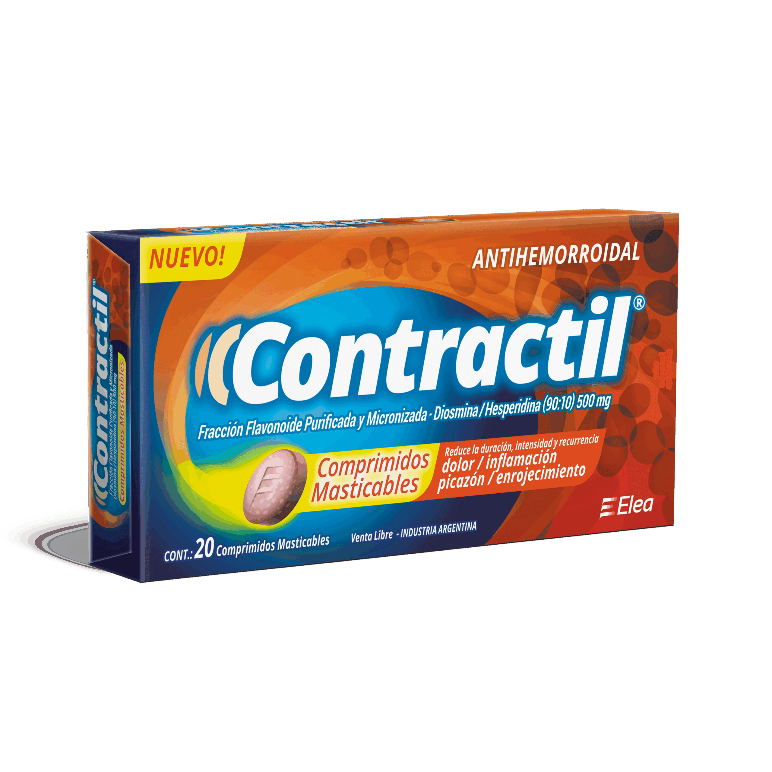 Acción: flebotónico, antihemorroidal. ¿Para qué se usa CONTRACTIL® COMPRIMIDOS MASTICABLES? • Ayuda a reducir los signos y síntomas asociados con hemorroides como secreción anal, picazón, dolor anal, enrojecimiento, inflamación anal. • Colabora a reducir la duración, intensidad y recurrencia de los episodios agudos relacionados a las hemorroides. ¿Qué personas no pueden utilizar CONTRACTIL® COMPRIMIDOS MASTICABLES? NO USE este medicamento si usted: • es alérgico al principio activo Fracción Flavonoide Purificada y Micronizada Diosmina/Hesperidina o a cualquiera de sus otros componentes. • Está embarazada o dándole el pecho a su bebé.