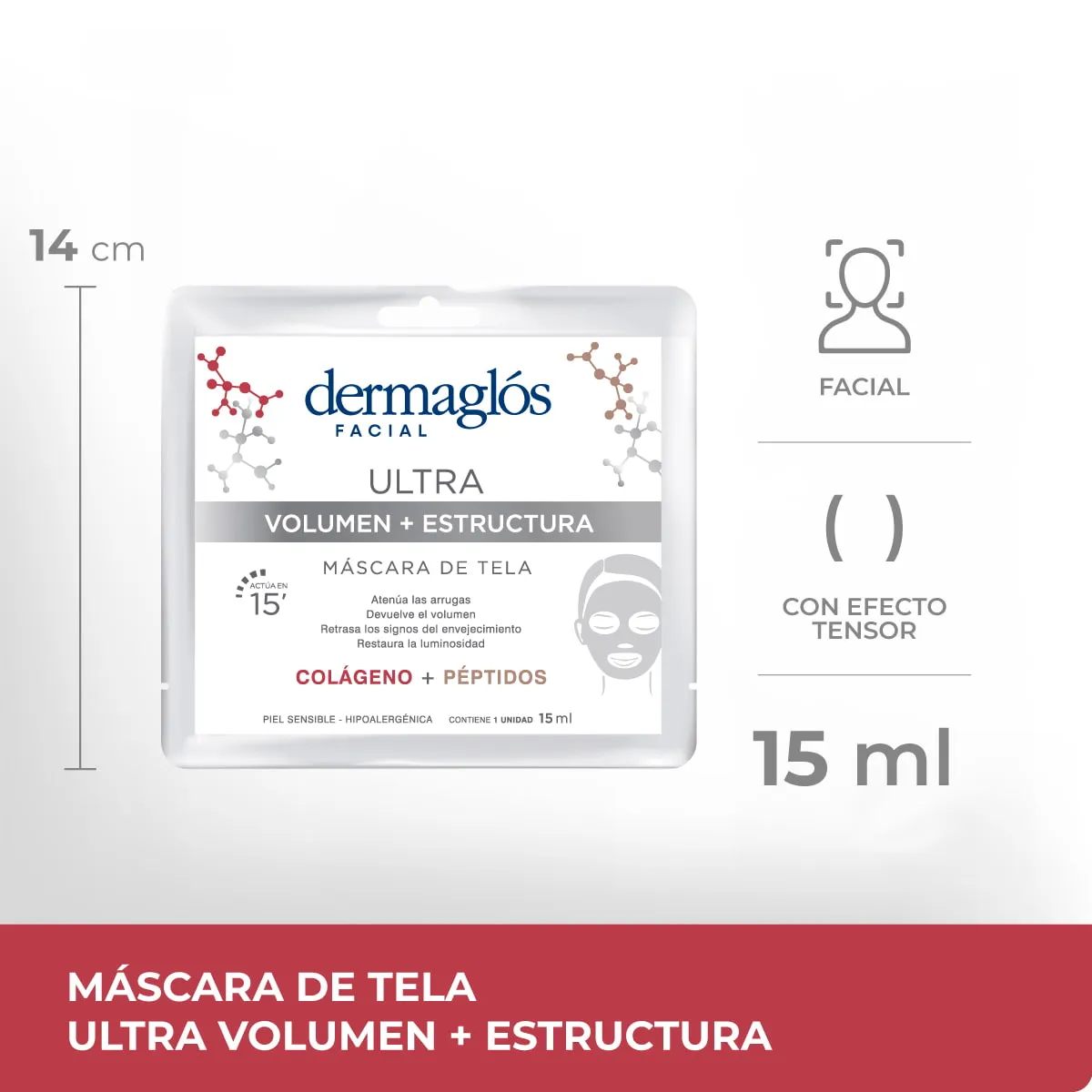 Experimentá una renovación profunda de tu piel con la máscara de tela Dermaglós Ultra Volumen + Estructura. Estas láminas de tela están impregnadas en una solución cosmética innovadora que previene la evaporación de los ingredientes, asegurando una penetración efectiva en la piel para resultados visibles y duraderos.