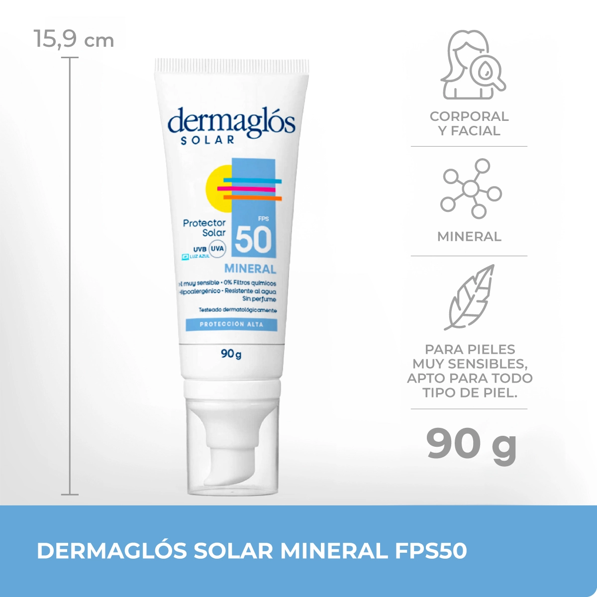 El Protector Solar Dermaglós FPS50 Mineral Emulsión es un fotoprotector de alta eficacia desarrollado especialmente para pieles muy sensibles, intolerantes o reactivas a filtros químicos. Su fórmula 100% mineral actúa como una barrera física que refleja los rayos UV, ofreciendo protección solar de amplio espectro (UVB y UVA) sin irritar la piel. Apto para todo tipo de piel, incluso para bebés a partir de los 6 meses, es una excelente opción tanto para adultos como para niños con piel delicada.
