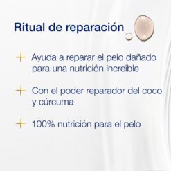 - Restauración Profunda con Coco y Cúrcuma: Enriquecido con aceite de coco, conocido por sus propiedades hidratantes y penetrantes, y cúrcuma, un ingrediente célebre por su capacidad para fortalecer y revitalizar. Juntos, trabajan para reparar el daño acumulado desde el primer uso.