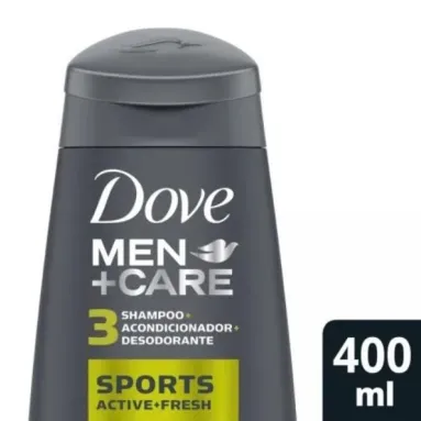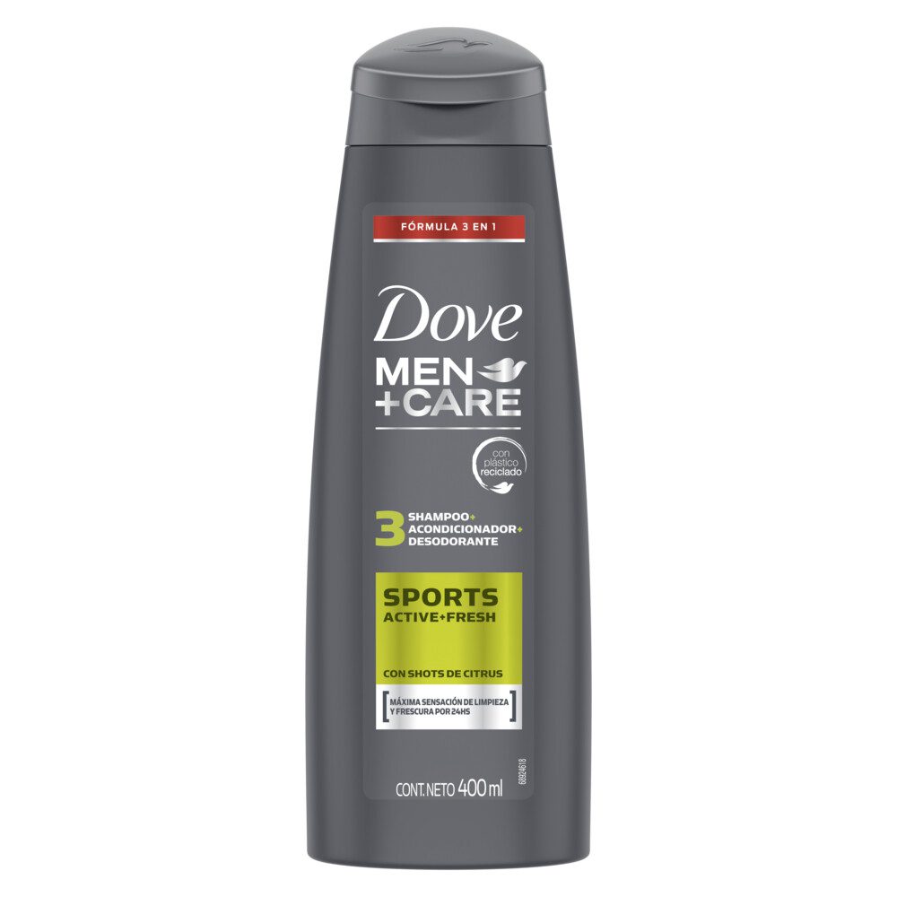 Shampoo Dove Men+Care Sport Active+Fresh 3 en 1 con su innovadora fórmula multifuncional actúa como shampoo, acondicionador y desodorante en un solo producto, proporciona una limpieza profunda y una sensación de frescura duradera de hasta 24 horas.