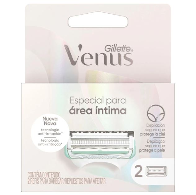La nueva Gillette Venus Especial para el Área Íntima recargable fue diseñada para cuidar y proteger la piel delicada del área íntima con nuestra mejor tecnología anti-irritación*. Su exclusiva barrera protectora permite remover el vello casi sin tocar la piel, ayudando a protegerla contra la irritación* y vellos encarnados. Además, la nueva Venus Especial para el Área Íntima cuenta con las hojas más afiladas de Venus para una depilación suave. Los repuestos incluyen una hoja extra detrás del cartucho, para una mayor precisión en los contornos y lugares difíciles de alcanzar y cuentan con doble lubricación, para un deslizar increíble. El producto está dermatológica y ginecológicamente testeado y su mango ergonómico es ideal para usar en la ducha. Para resultados increíbles, utilice la línea completa Venus Especial para el Área Íntima*irritación del afeitado.
