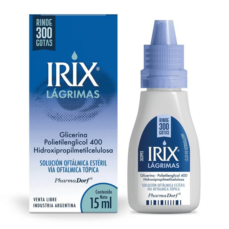 Irix Lagrimas Solución Oftálmica 15ml. 1.¿QUÉ CONTIENE IRIX® LÁGRIMAS? Cada 100 mililitros contiene: Glicerina 200 miligramos; polietilenglicol 400 1 gramo; hidroxipropilmetilcelulosa 200 miligramos. Excipientes: povidona K30; cloruro de sodio USP; ácido bórico; cloruro de potasio; dextran 70; cloruro de magnesio hexahidrato; lactato de sodio solución al 50 %; borato de sodio decahidrato; cloruro de calcio dihidrato; polihexanida clorhidrato al 20 %; agua para inyectable c.s. 2.¿QUÉ ES IRIX® LÁGRIMAS? IRIX® Lágrimas son gotas oftálmicas de uso oftálmico tópico. No debe utilizarse si la tapa no se encuentra intacta. 3.¿Para qué se utiliza IRIX® LÁGRIMAS? IRIX® Lágrimas es un humectante y lubricante del ojo especialmente formulado para el alivio de ojo seco y para reconfortar los ojos irritados. Se indica en: •Casos de sequedad y/o irritación del ojo. •Casos de ardor ocular causado por vientos, temperaturas elevadas, aire acondicionado, uso de computadoras. Este producto es apto para el uso junto con lentes de contacto. ¿Cómo usar IRIX® LÁGRIMAS? IRIX® Lágrimas puede aplicarse cuantas veces sea necesario de acuerdo con la frecuencia e intensidad de los síntomas. Se administra por vía oftálmica tópica según el siguiente esquema: Colocar 1 ó 2 gotas en el ojo u ojos afectados 4 a 6 veces por día, según la intensidad de los síntomas