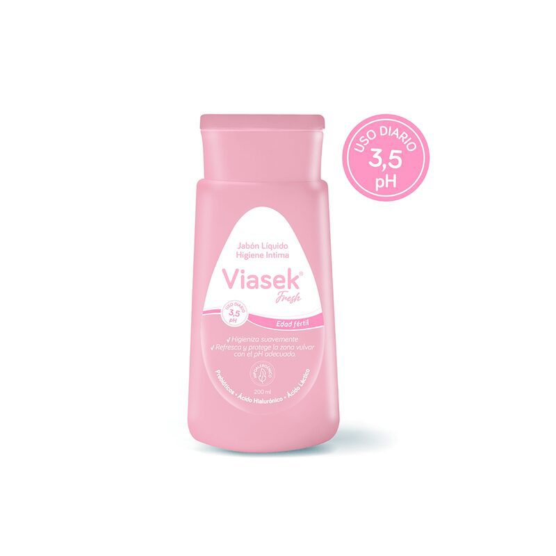 Viasek Fresh es un jabón líquido especialmente formulado para la higiene íntima femenina durante la etapa fértil. Su fórmula con pH 3.5 respeta el equilibrio natural de la zona íntima y contiene activos que fortalecen la flora vaginal, protegen contra el mal olor y brindan una sensación de frescura y suavidad. Enriquecido con prebióticos, ácido hialurónico y ácido láctico, este limpiador íntimo ayuda a mantener la microbiota natural, hidrata la mucosa y contribuye a la regulación del pH. Además, está elaborado con un agente limpiador suave derivado del aceite de coco que no irrita ni reseca. Libre de parabenos, perfumes, colorantes y jabones alcalinos, Viasek Fresh es hipoalergénico, no testeado en animales y pensado para un cuidado respetuoso y cotidiano.